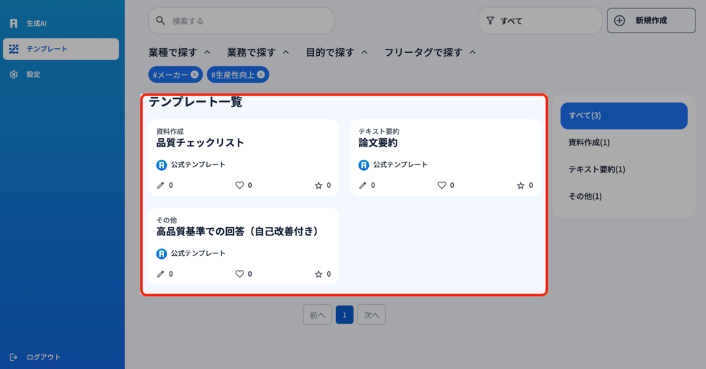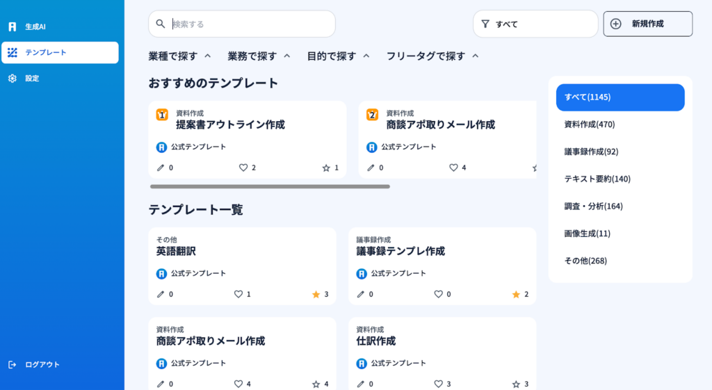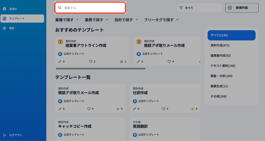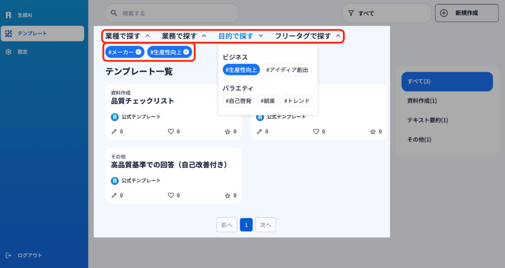 1)AiCOMPには様々なテンプレートが設定されています。『業種で探す』『業務で探す』『目的で探す』『フリータグで探す』これらの要素をそれぞれのテンプレートはジャンル分けされているので、探しているテンプレートがすぐ見つかります。