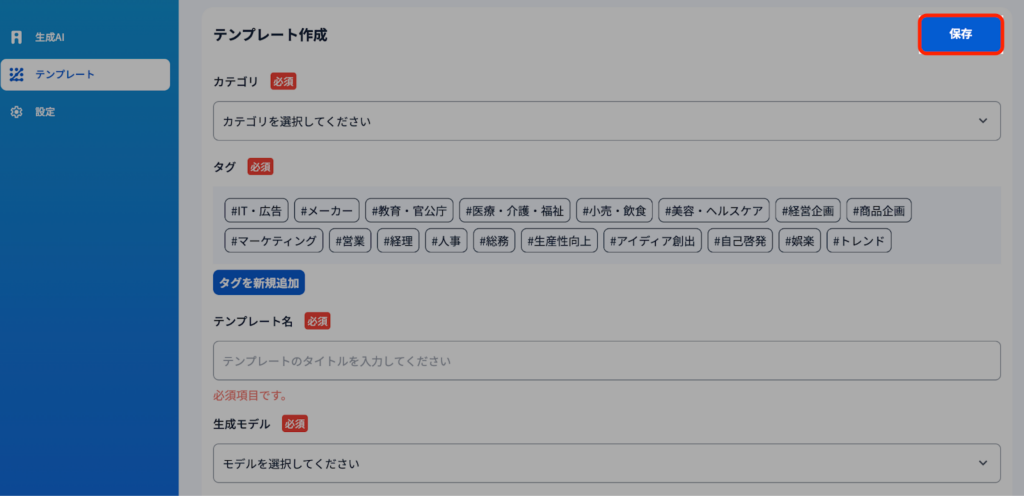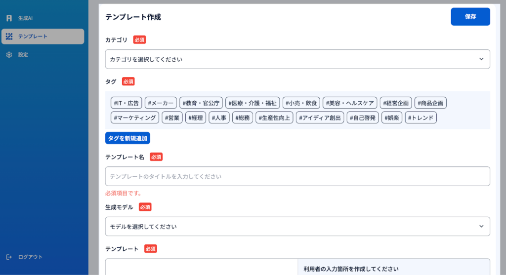 2)作成するテンプレートのカテゴリを選択し、関連するタグをつけます。テンプレートの名前をつけます。(業務名等わかりやすいものが推奨されます。)使用したいAIモデルを指定し、実行したい命令プロンプトを入力します。※テンプレートは単一のAIモデルを指定する必要があります。