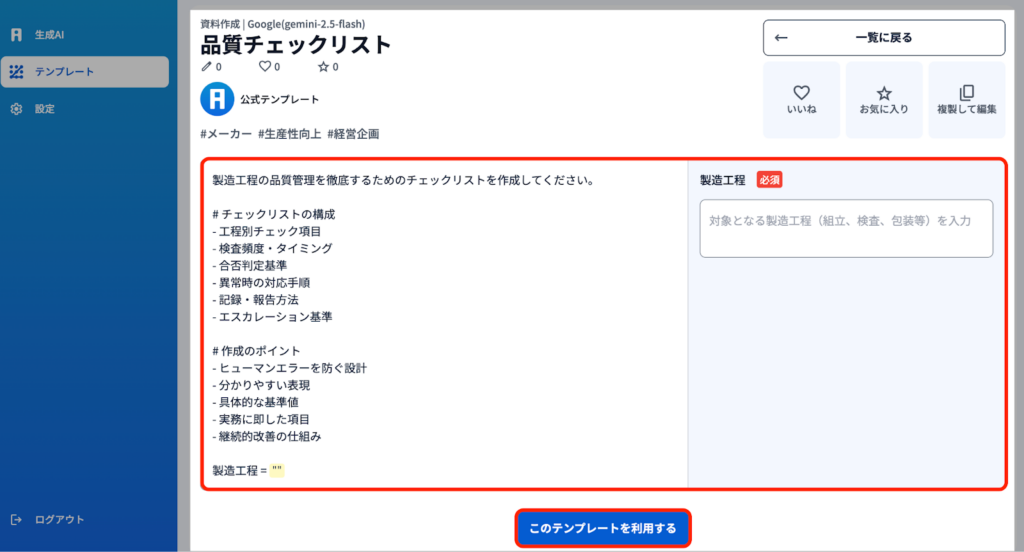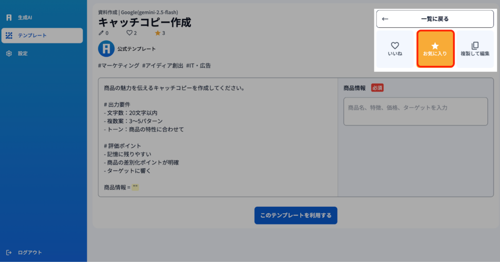 2)テンプレートをクリックすると、ポップアップが表示され、”プロンプト”内容が表示されます。右のテキストボックスに内容を入れ『このテンプレートを利用する』をクリックすると実行されます。