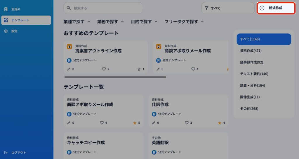 1)画面右上にある『新規作成』ボタンからテンプレートを新しく作成することができます。