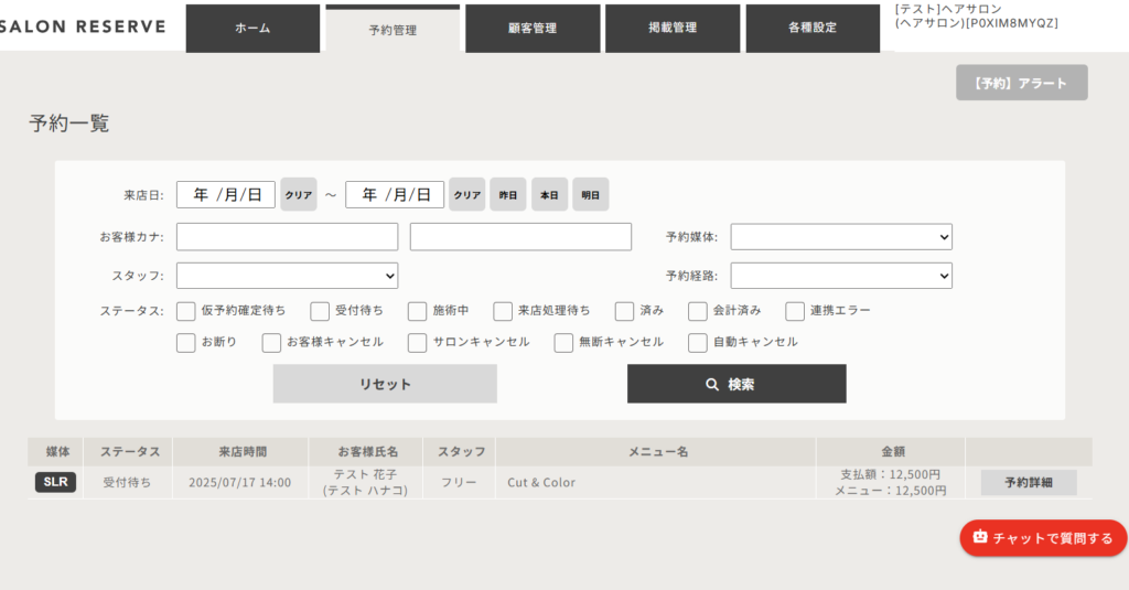 画面上部の検索情報欄に情報を入力→検索を押下することで予約状況を絞り込むことができます。