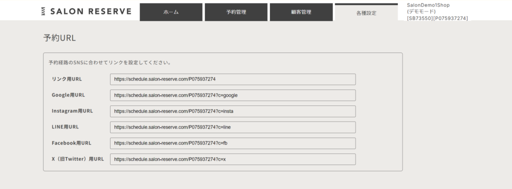 予約経路(流入経路)に応じたパラメータ付きURLが表示されています。使用しているSNSに該当URLを設置することで、当該SNSから予約が入ったことが集計されます。