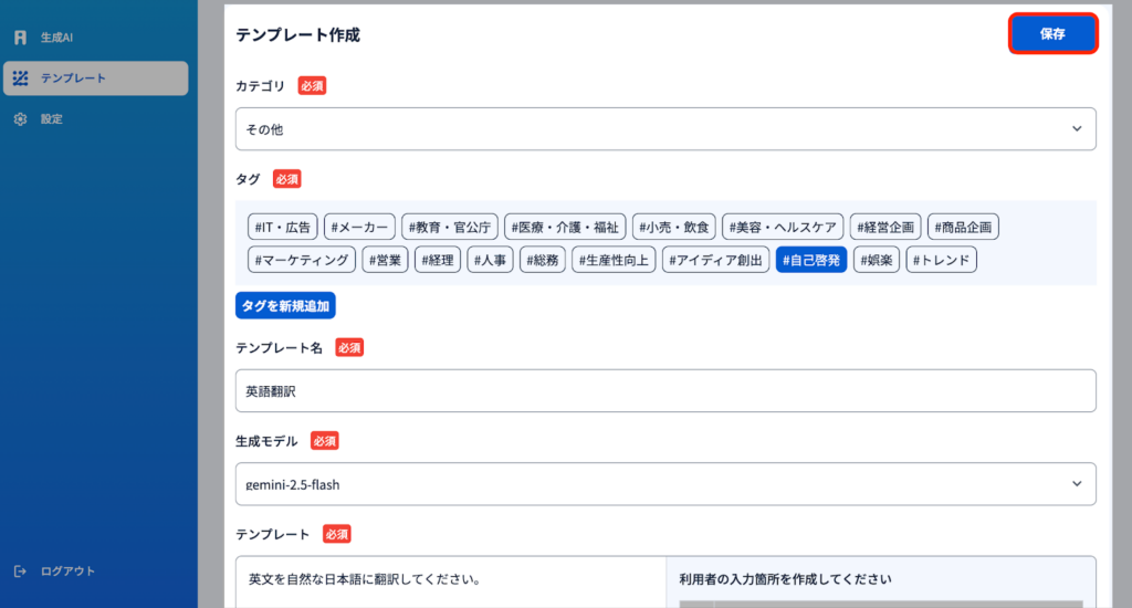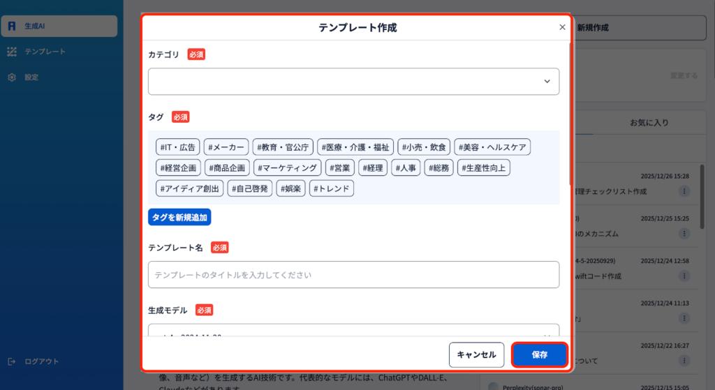 2)フロッピーアイコンをクリックすると、テンプレートとして保存するための属性入力画面がポップアップします。『カテゴリ』『タグ』『テンプレート名』『生成モデルの選択』『テンプレート入力箇所』の入力をし、保存を押します。