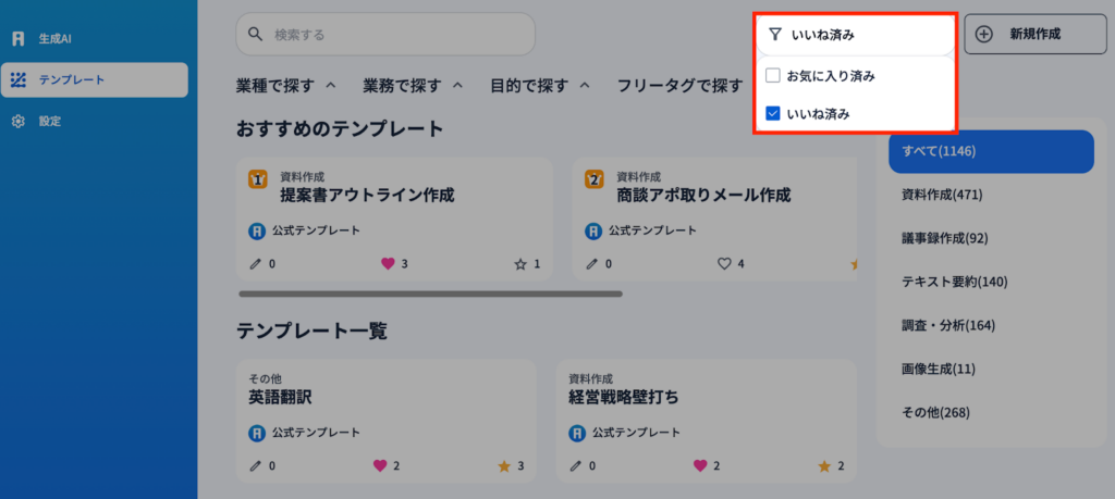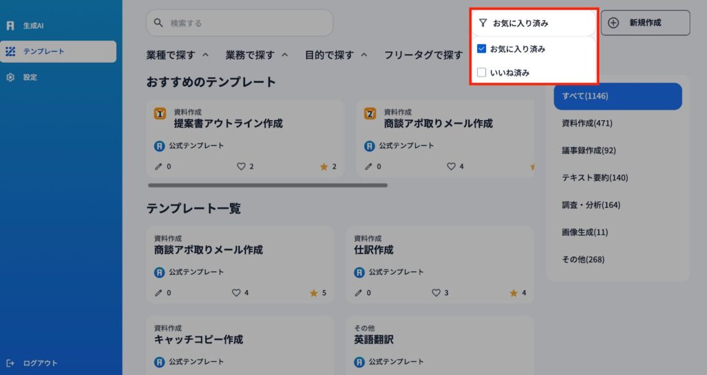 2)お気に入りに設定されたテンプレートは、『生成AI(メイン画面)』の右側にある『お気に入り』から簡単に呼び出し使うことができます。
