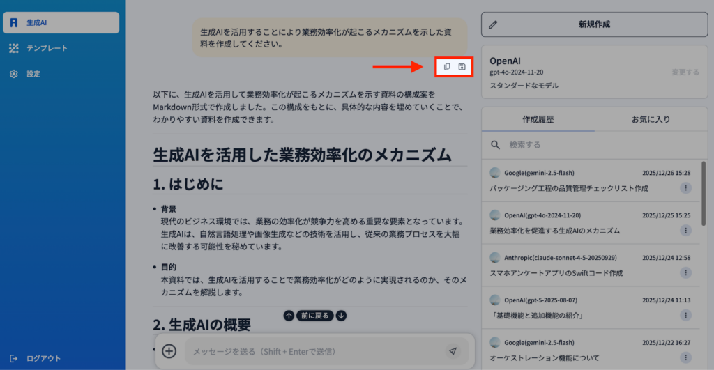 1)AIとのチャット画面では、プロンプト入力後のメッセージおよび出力結果の下に、コピー用のマークが表示されます。このマークをクリックすると内容がコピーされ、そのまま他のチャットなどに貼り付けることができます。