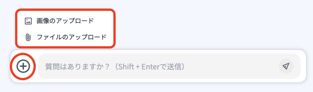 1)チャット画面でAIに対するプロンプトに『画像/ファイル』を添付データとしてアップロードできます。