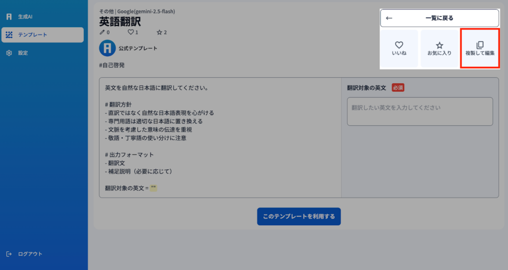 1)既存のテンプレートを自分好みのプロンプトテンプレートにカスタマイズすることが可能です。例えば同じプロンプトを異なるAIモデルで実行させたい時などが有用です。