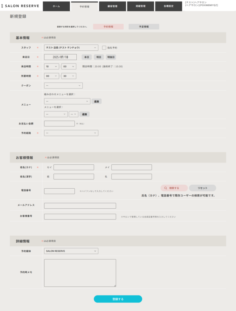 予約の登録画面は、以下のように「基本情報」「お客様情報」「詳細情報」のパートに分かれています。