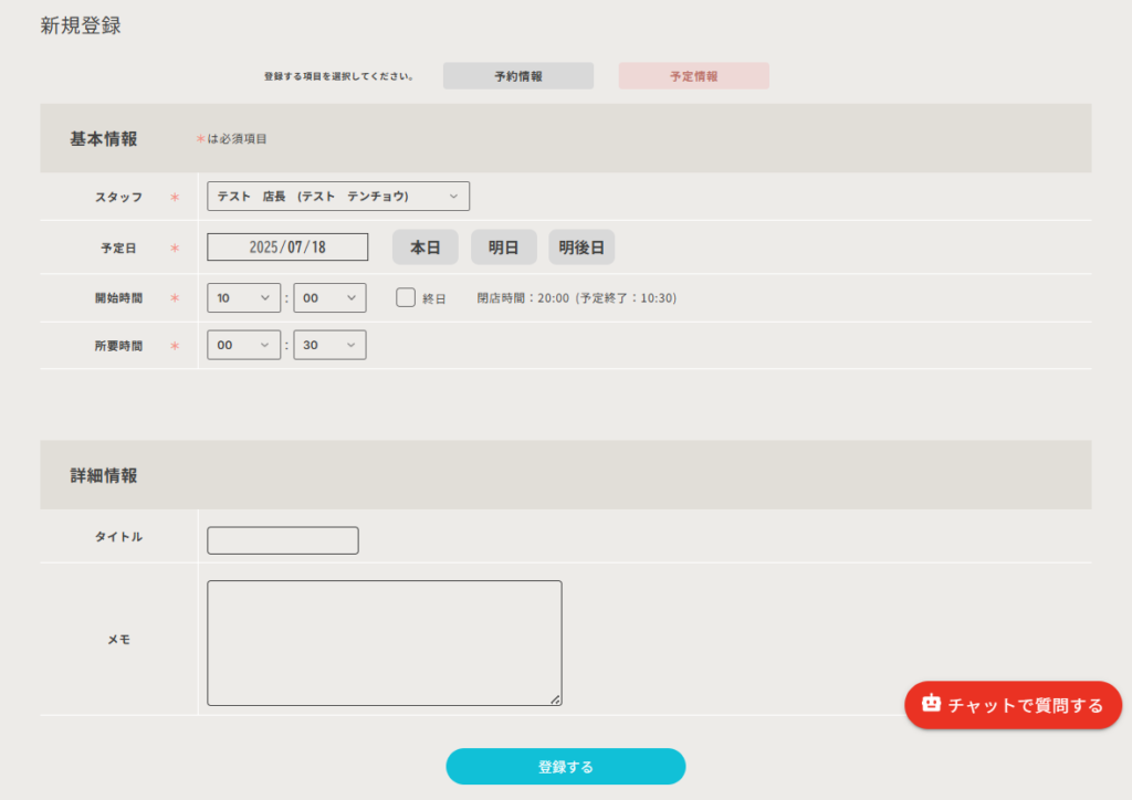 ここでは「予約の登録」と「予定の登録」の両方を行うことができます。