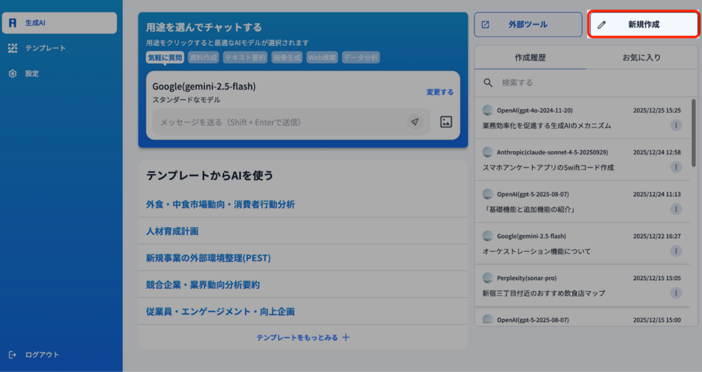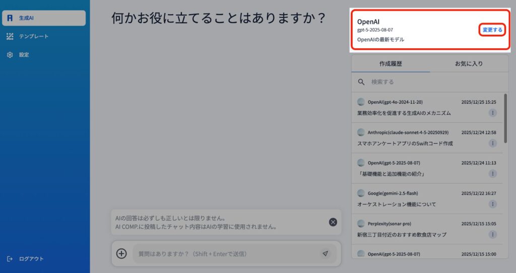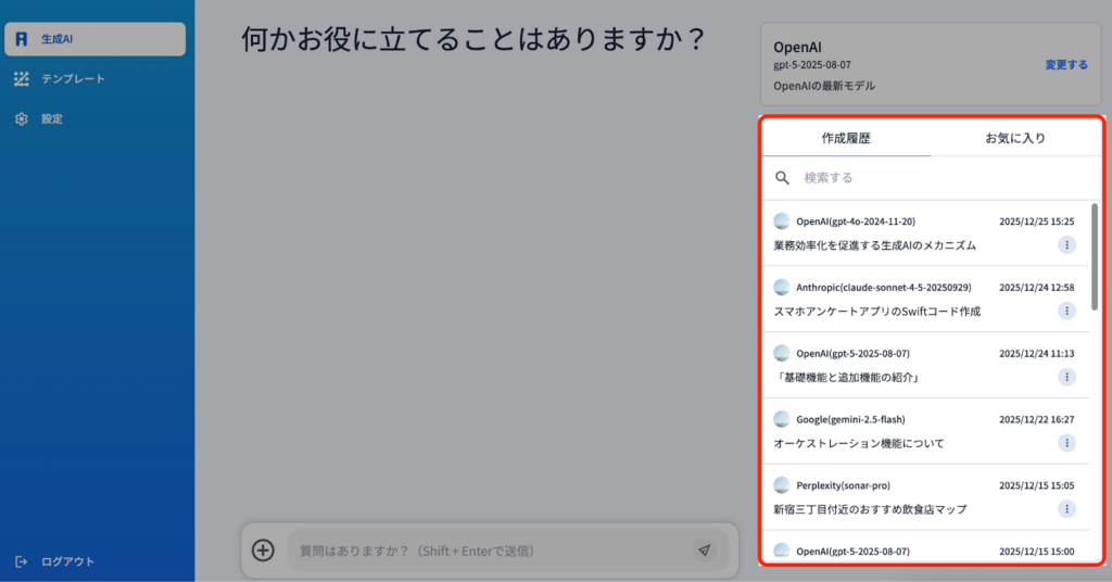 2)履歴に表示されているチャット内容をクリックすることによって、同じチャットを同じAIモデルで出力できます。※出力内容はAIのバージョンによって変化する場合があります。
