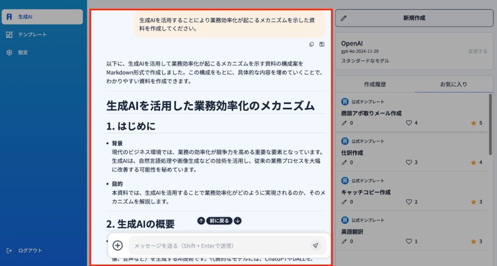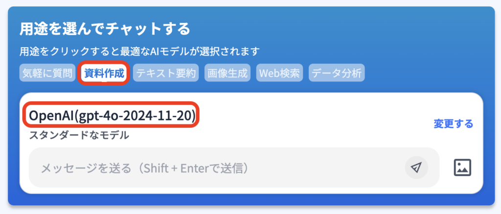 2)例えば『資料作成』を選択するとデフォルトで設定されているモデルが選択されます「OpenAI(gpt-4o)」が選択されます。