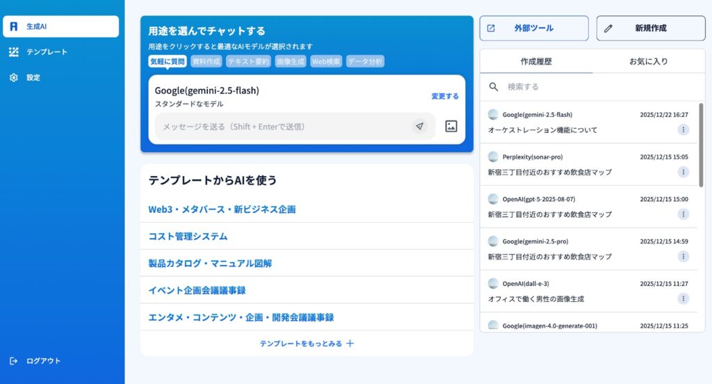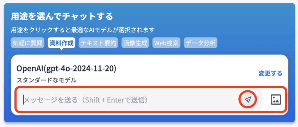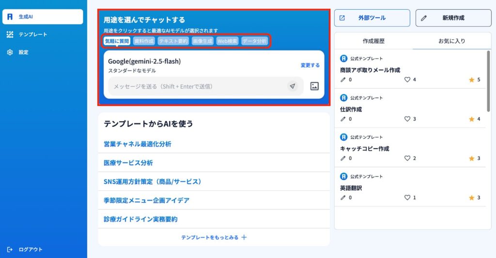 1)「用途」に応じて、最適なAIモデルが選択可能です。『気軽に質問』『資料作成』『テキスト要約』『Web検索』『データ分析』、これらの用途をクリックすると最適なAIモデルが自動で選択されます。