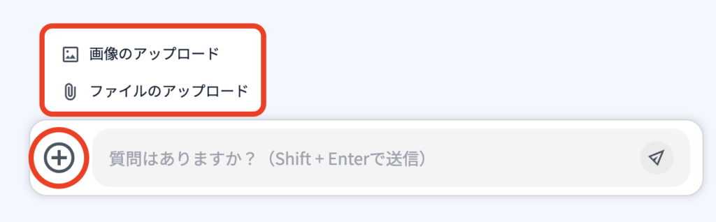 3)※テキストボックスの左にある『+』ボタンを押すことによって、AIに参照してほしい画像/ファイルをアップロードできます。