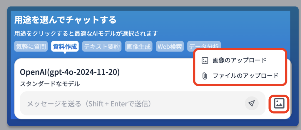 4)※この際にファイルや画像をアップロードしたい場合は、テキストボックスの右にある画像アイコンをクリックすることによって『画像/ファイルをアップロード』から実際にAIに参照してほしいデータを添付できます。