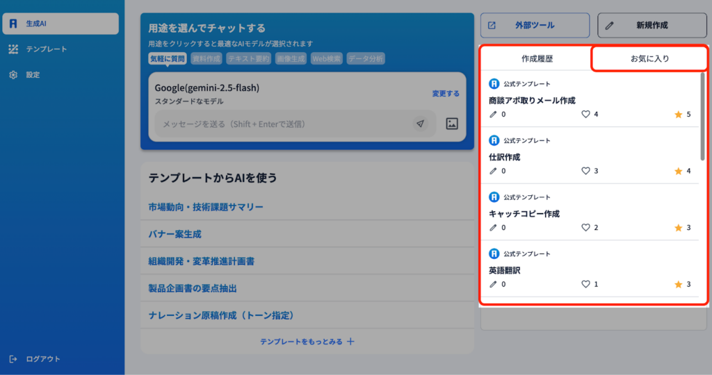 1)画面右にある『お気に入り』タブをクリックすると、自分でお気に入り登録したテンプレートが表示されます。