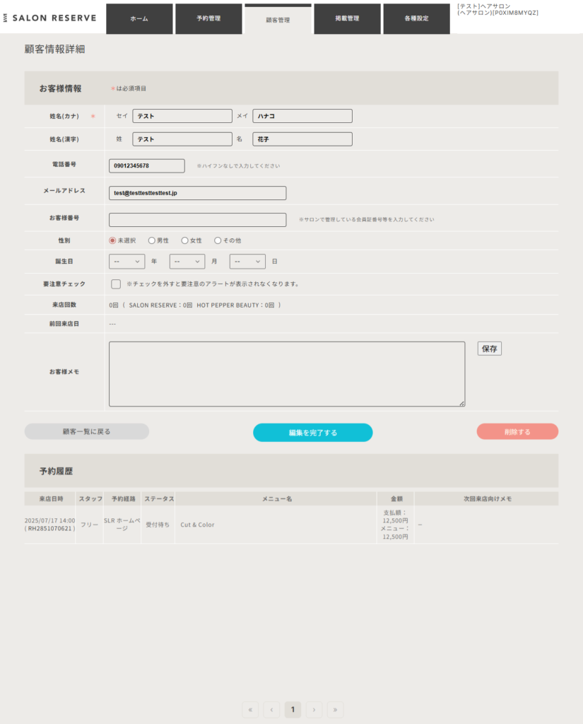 この画面では、一覧画面に表示されている情報以外に、お客様番号や誕生日、メモ情報を編集できます。